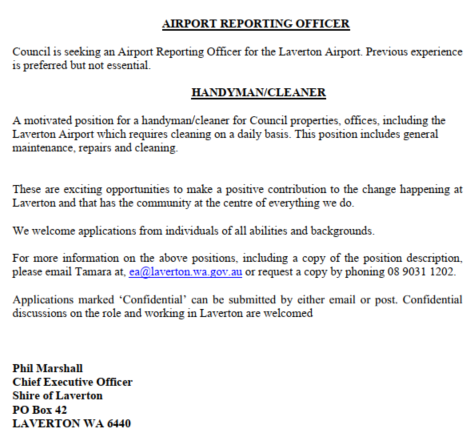 Works Supervisor, Mechanic, Parks and Gardens Officers, Airport Reporting Officer and Handyman/Cleaner Positions Vacant